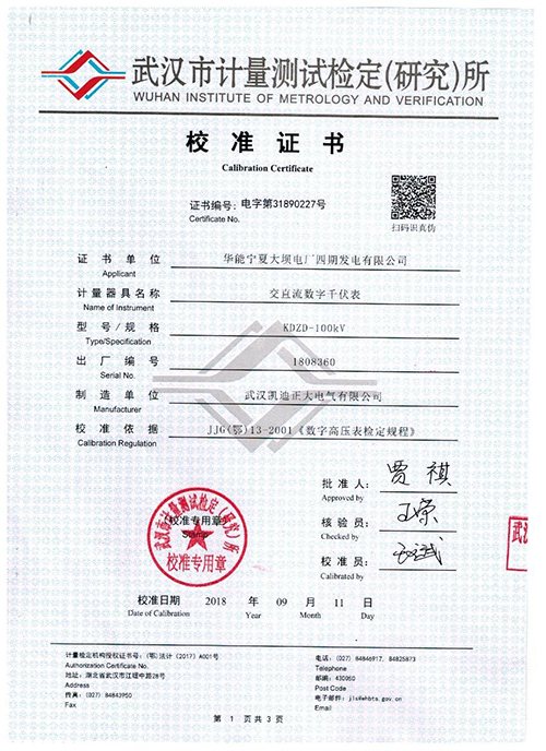 武漢凱迪正大KDZD-100KV交直流數字千伏表校準證書