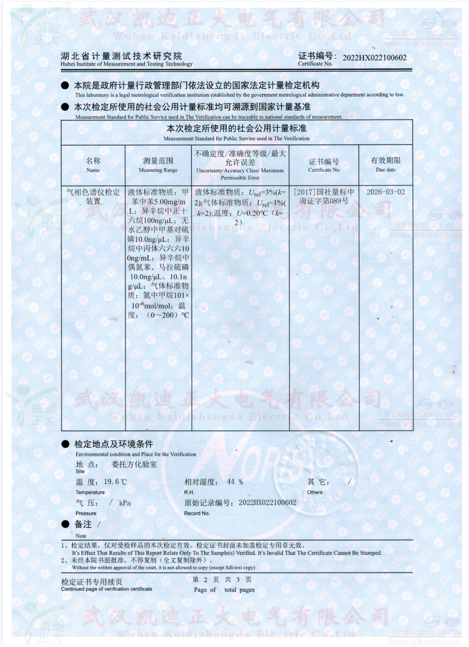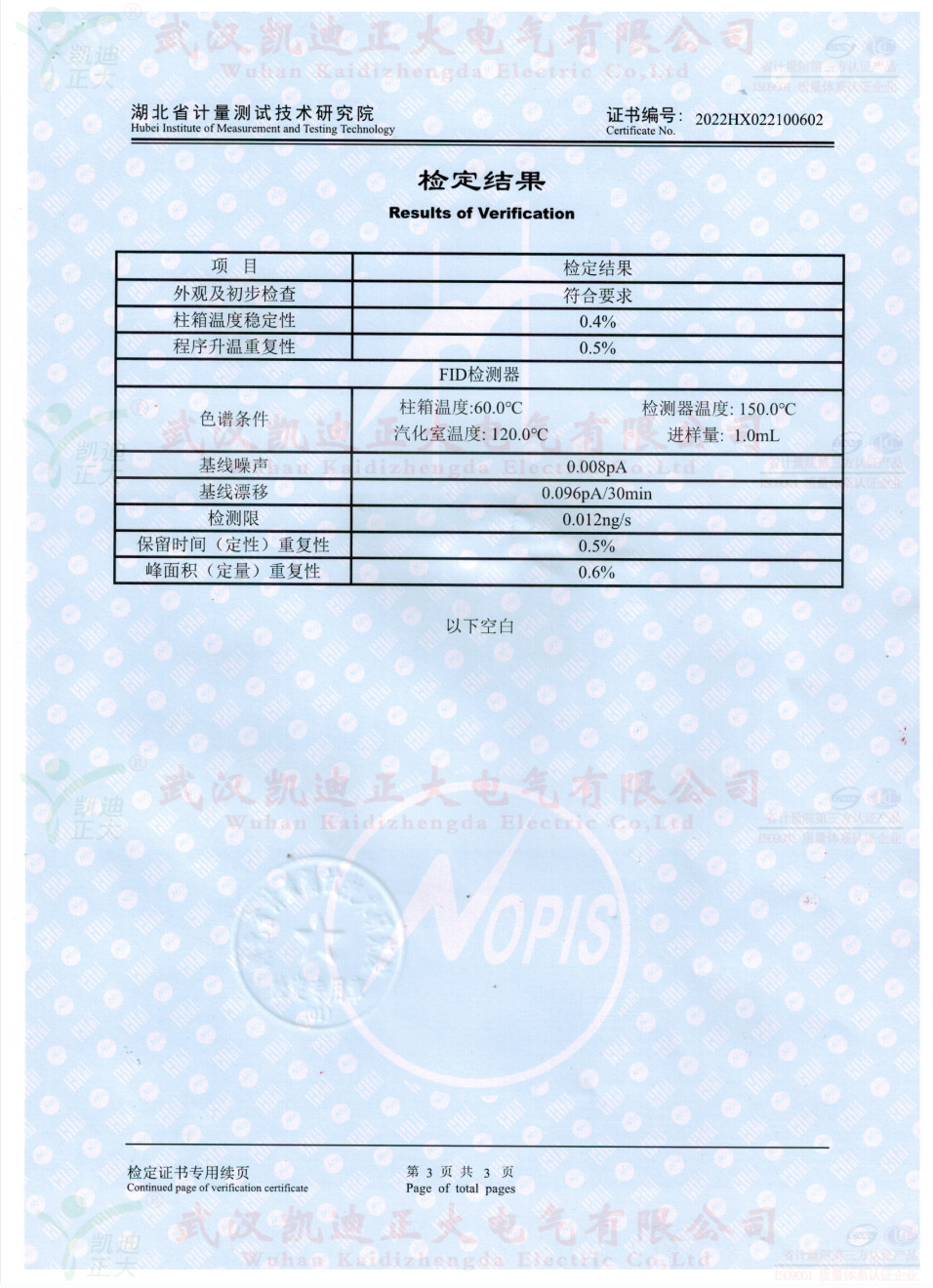 獲得國網湖北省電科院蔡工的青睞,了解了色譜儀的性能后,要求設備獲得湖北省計量院檢定報告。2022年10月,我司生產好KDZD9560氣相色譜儀后,按照JJG700-2016《氣相色譜儀檢定規程》進行送檢,檢定結果為合格。送檢單位電力工業電氣設備質量檢驗測試中心,計量器具KDZD9560氣相色譜儀符合相關標準。