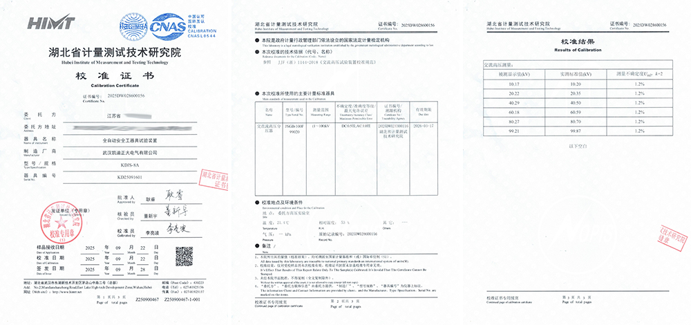 江蘇某灌溉單位采購武漢凱迪正大KDJS-8A型全自動(dòng)安全工器具試驗(yàn)裝置,經(jīng)湖北省計(jì)量測(cè)試技術(shù)研究院嚴(yán)格校準(zhǔn),取得了編號(hào)為2025DW028600156的校準(zhǔn)證書。
